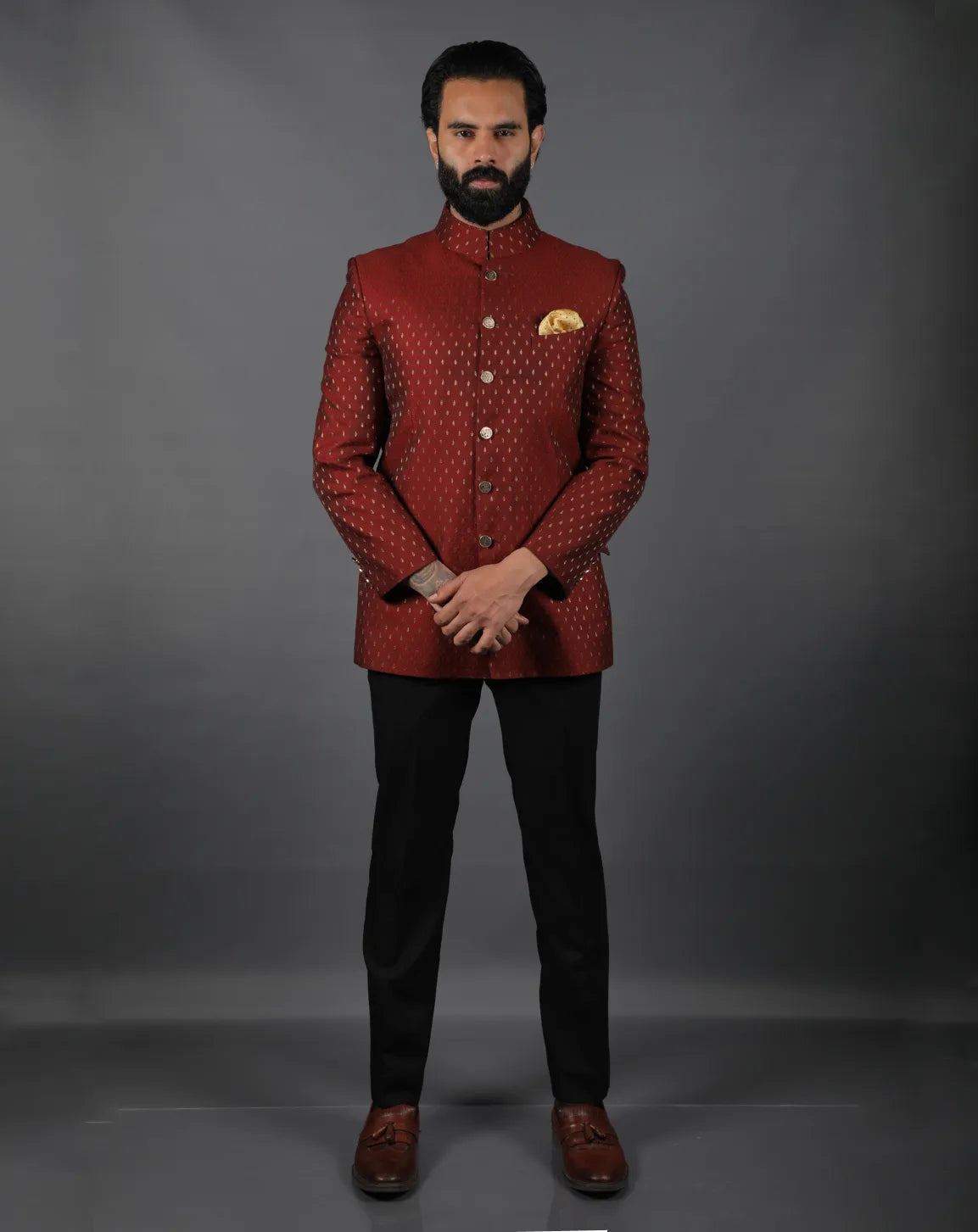 Rustic Red bandhgala is crafted from a premium blend of brocade silk; it features intricate golden woven motifs and a structured mandarin collar.