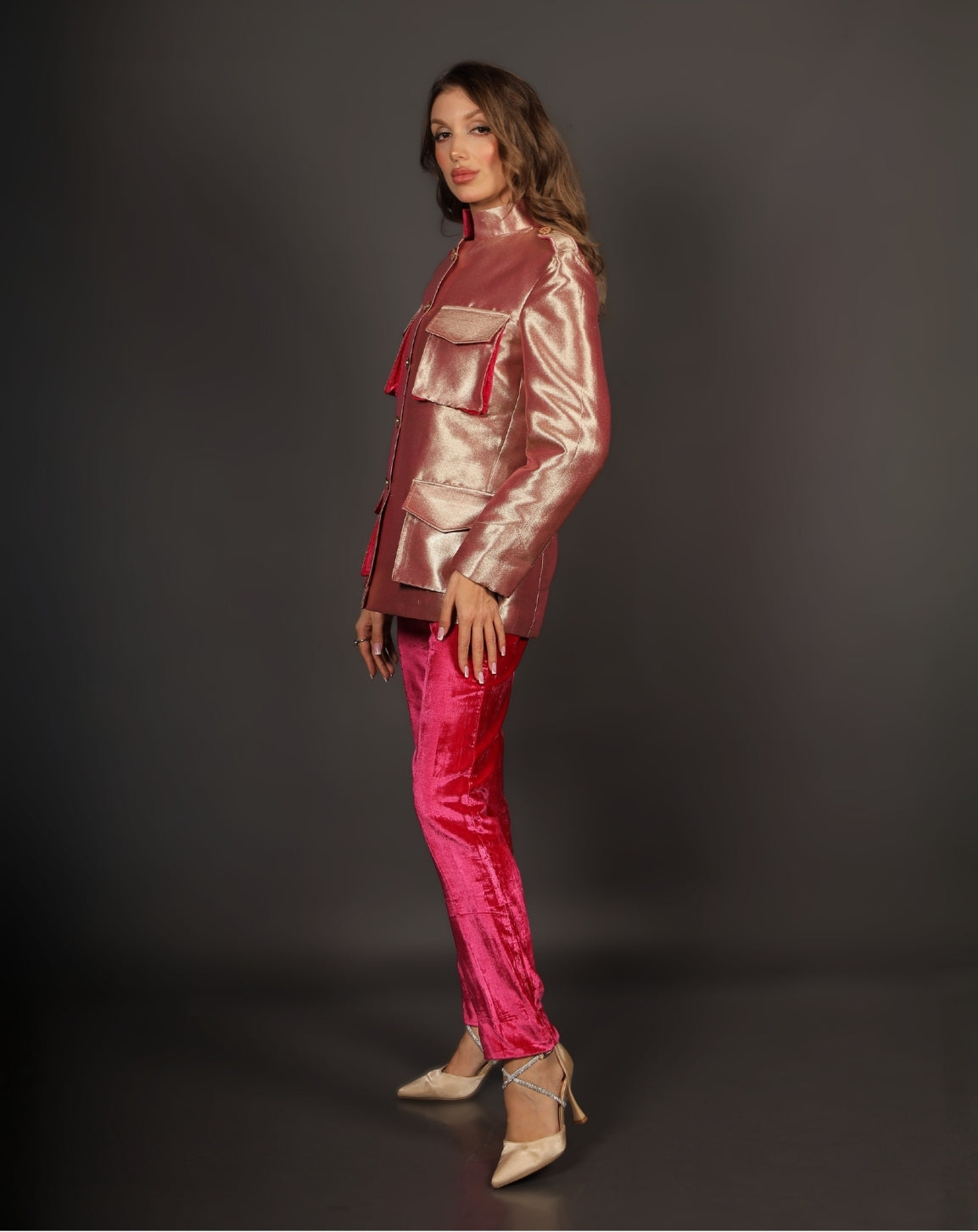 This 4-pocket hunting blazer set features a stylish pink brocade blazer paired with pink velvet pants, creating a look that’s both refined and fashion-forward. The blend of brocade’s intricate texture and velvet’s soft sheen adds depth and luxury, making it a perfect choice for festive celebrations, weddings, or statement evening events.