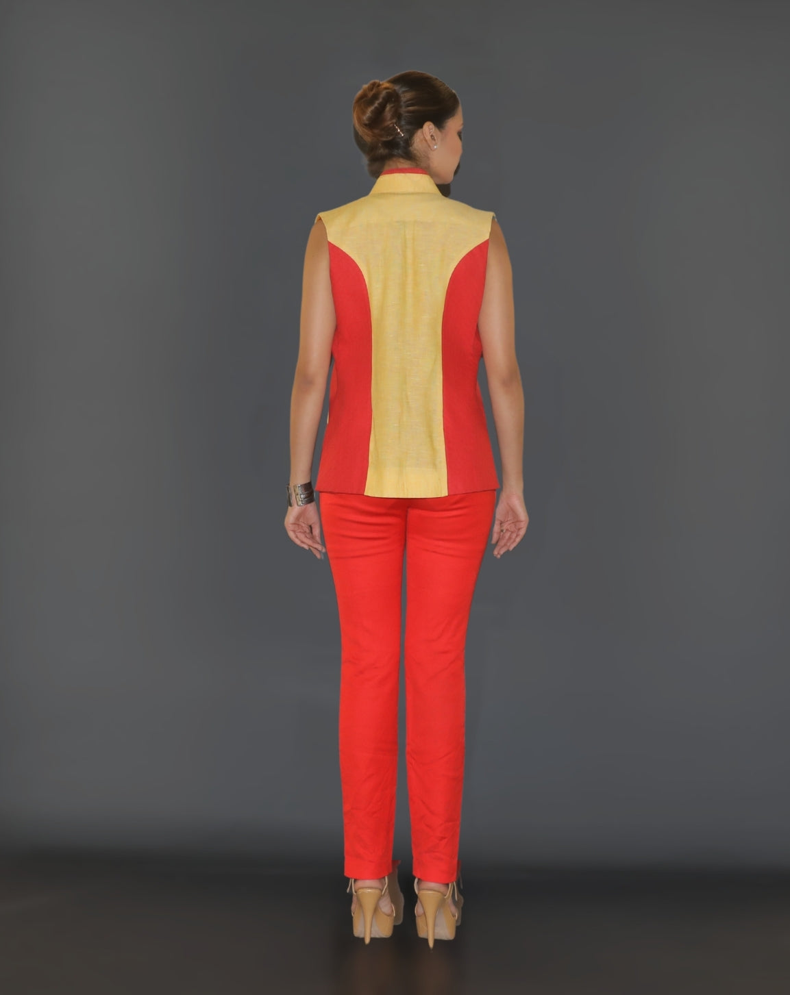 This linen half jacket set, which includes an orange and yellow jacket and orange pants, exudes lively elegance. Comfort and festive sophistication are perfectly balanced by the breathable fabric and vibrant colors.
