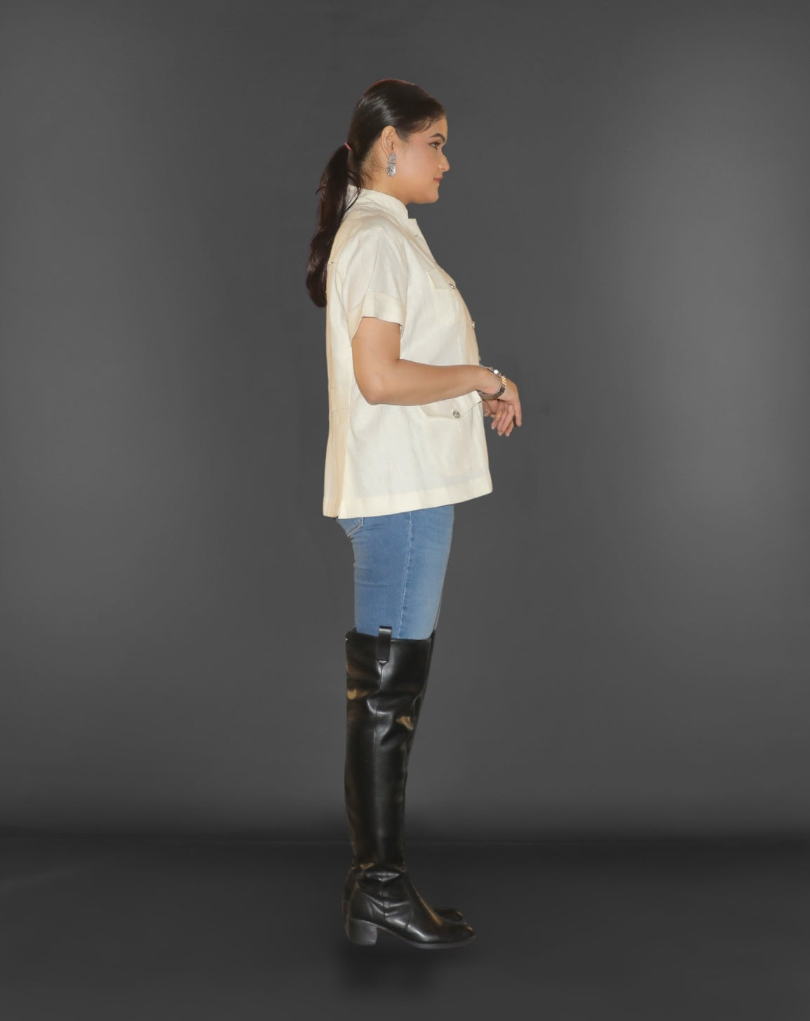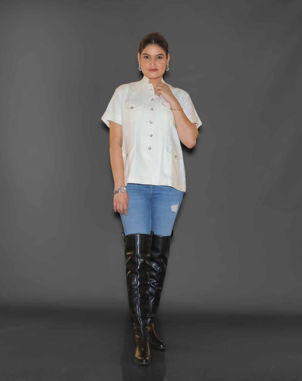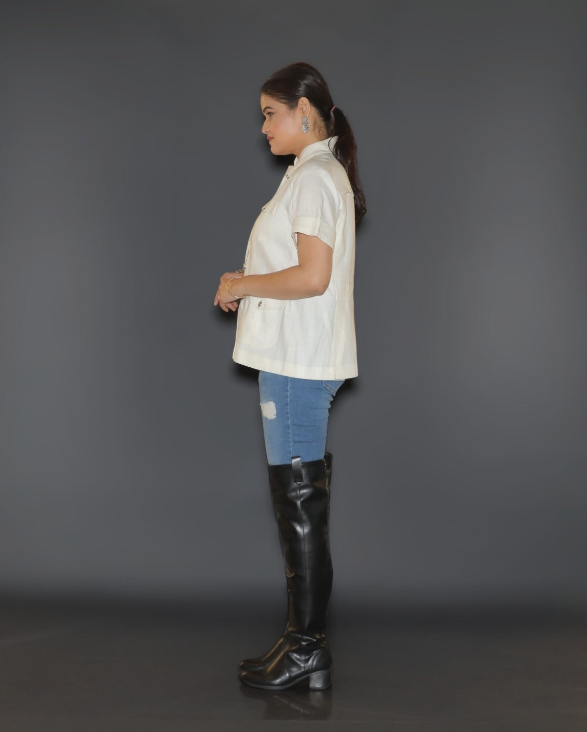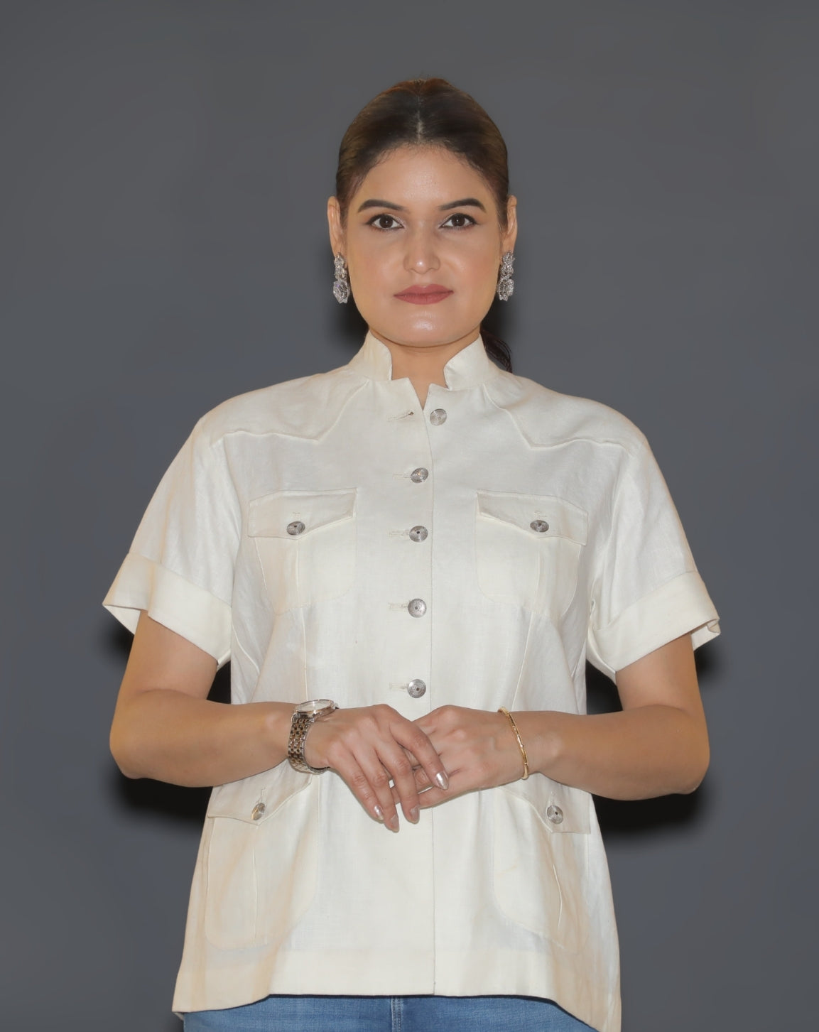 This cream hunting shirt, made of breathable linen, exudes understated elegance. It's ideal for a polished yet carefree look because of its simple design and cozy fit.