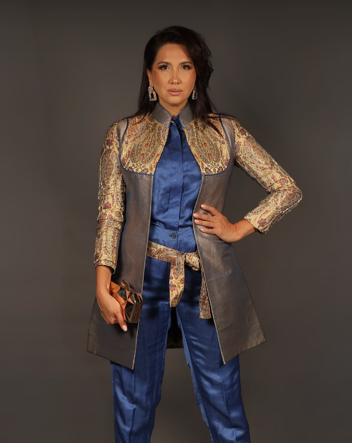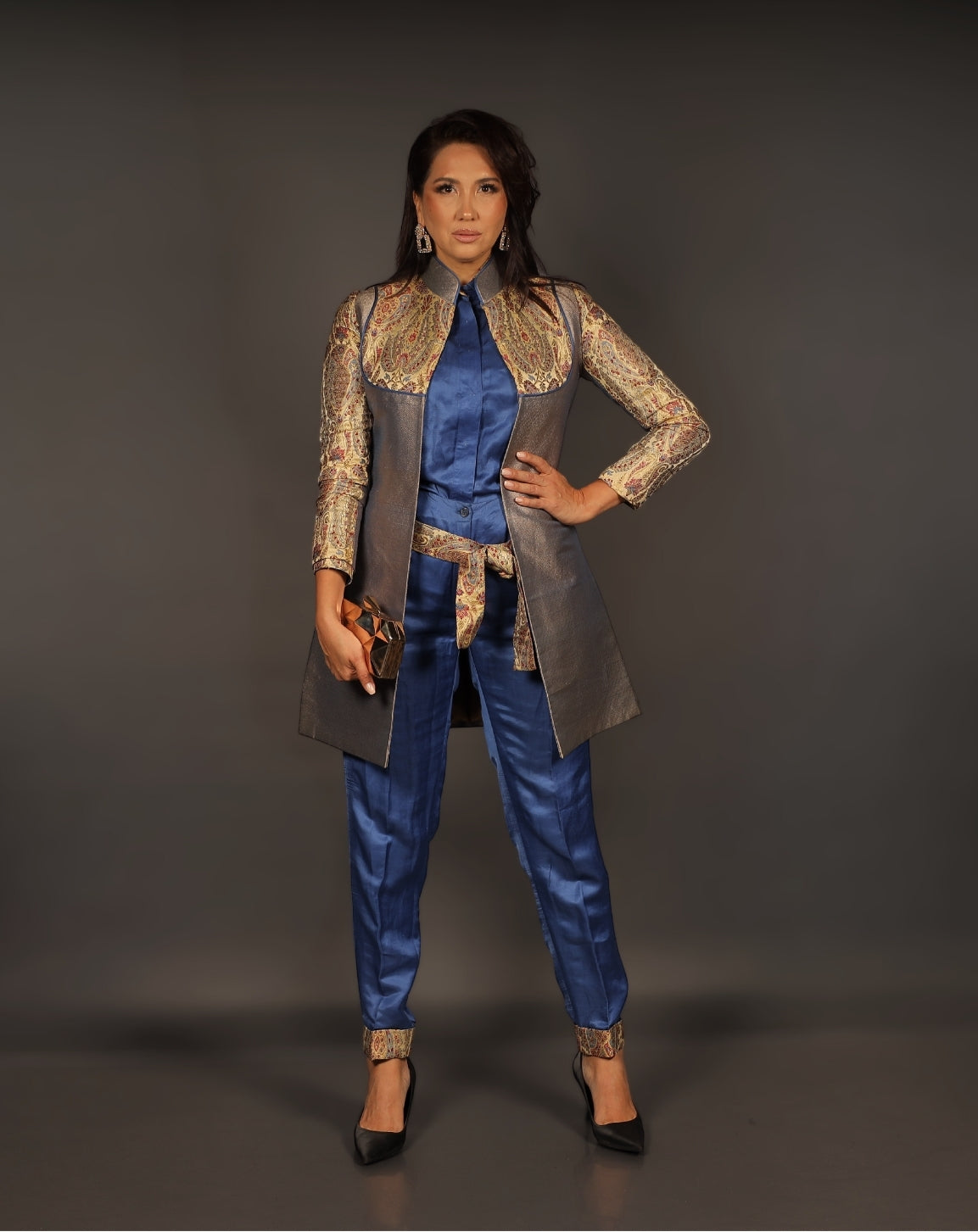 This light grey Indo-Western outfit, which is made of opulent brocade fabric with a designer print, exudes modern elegance. Its elegant texture and modern accents perfectly combine style and tradition.