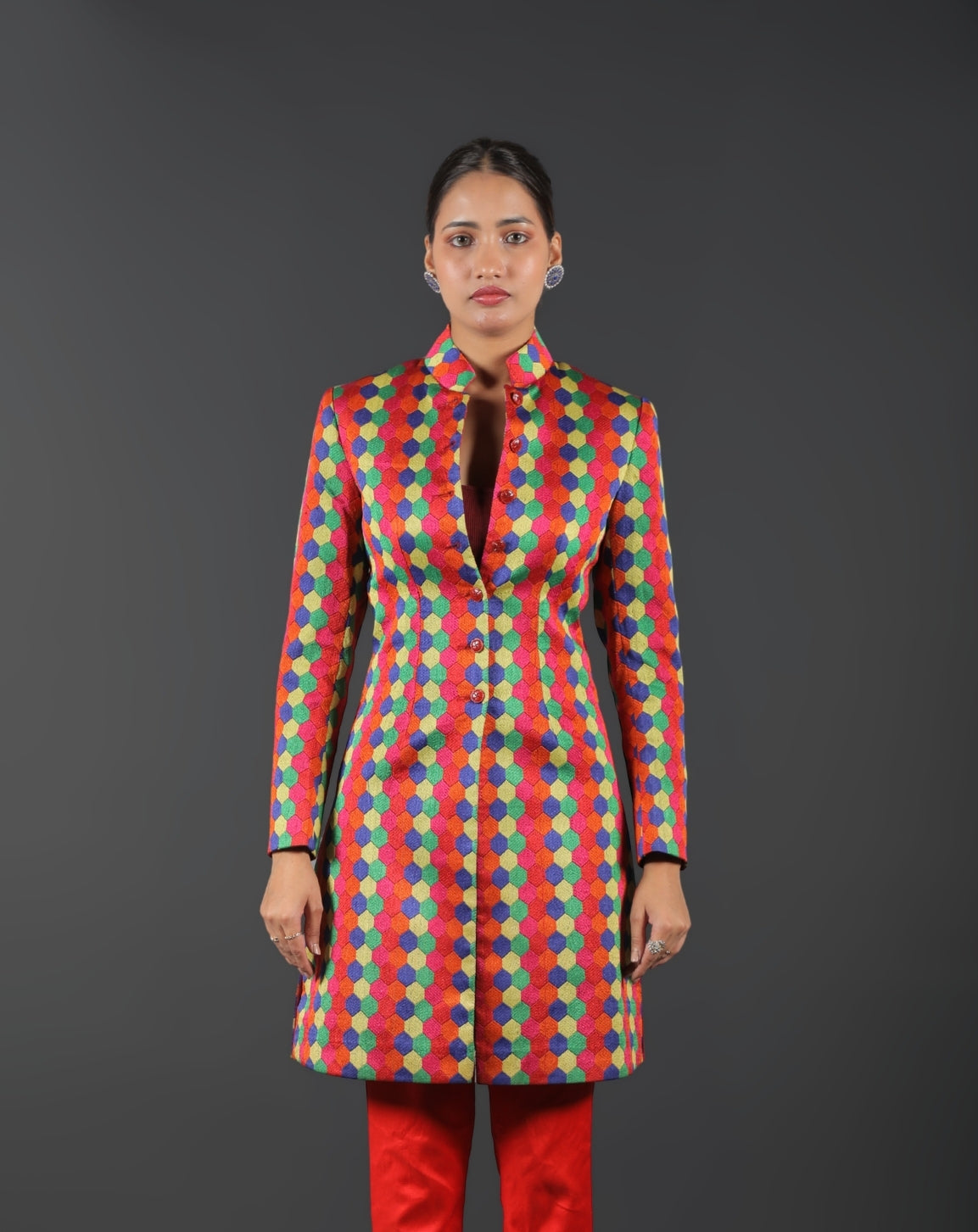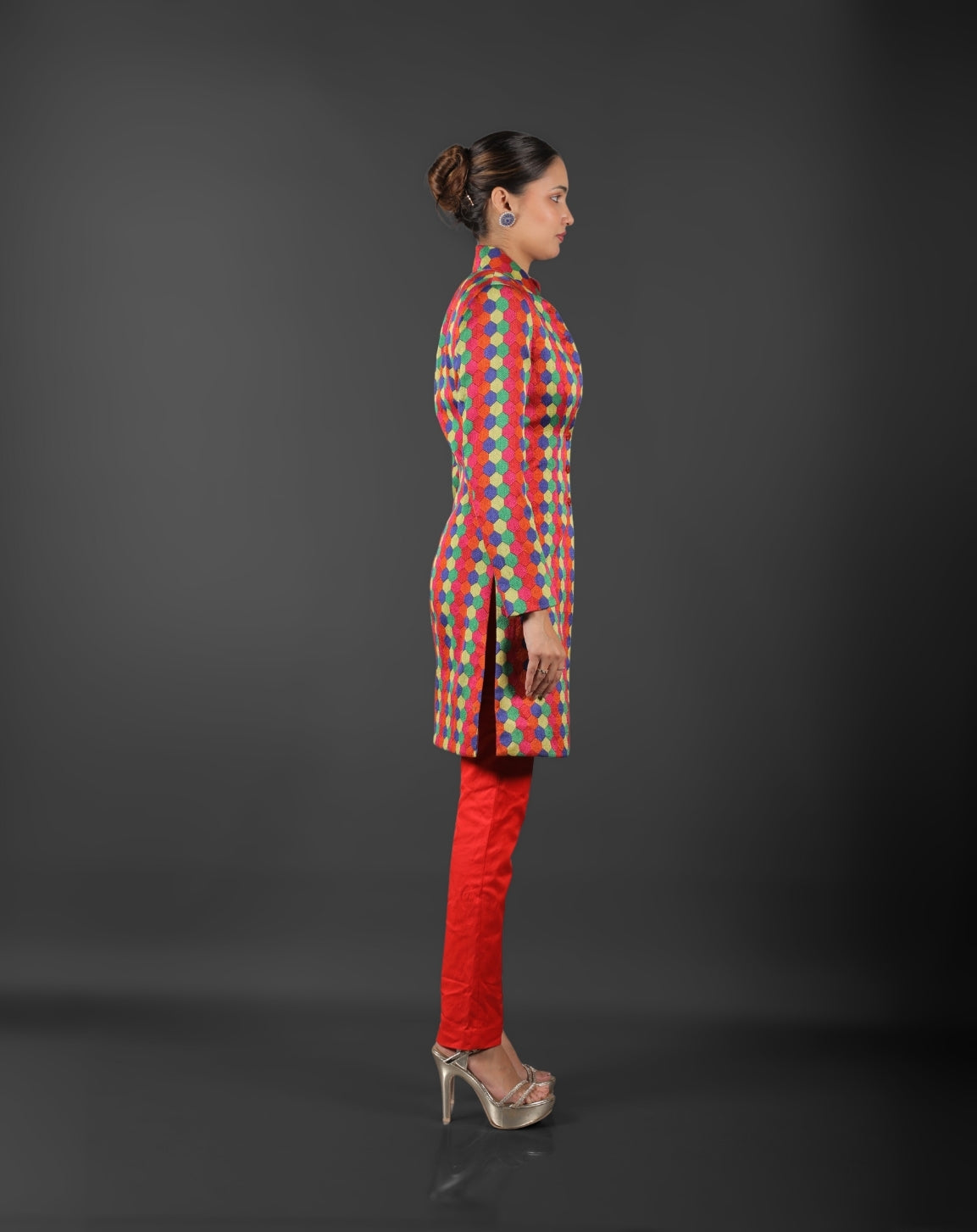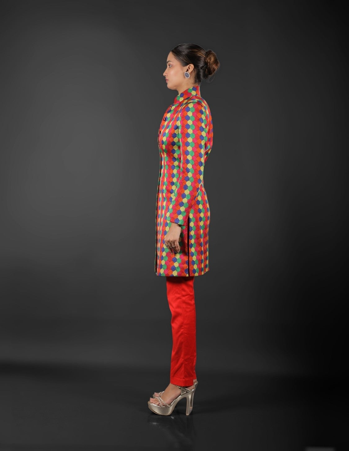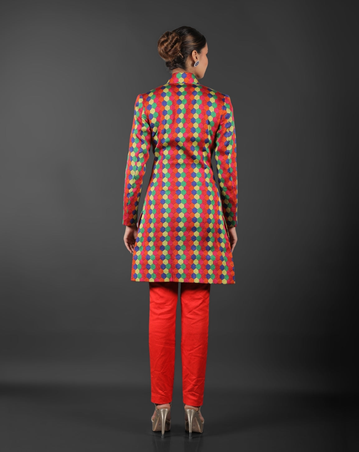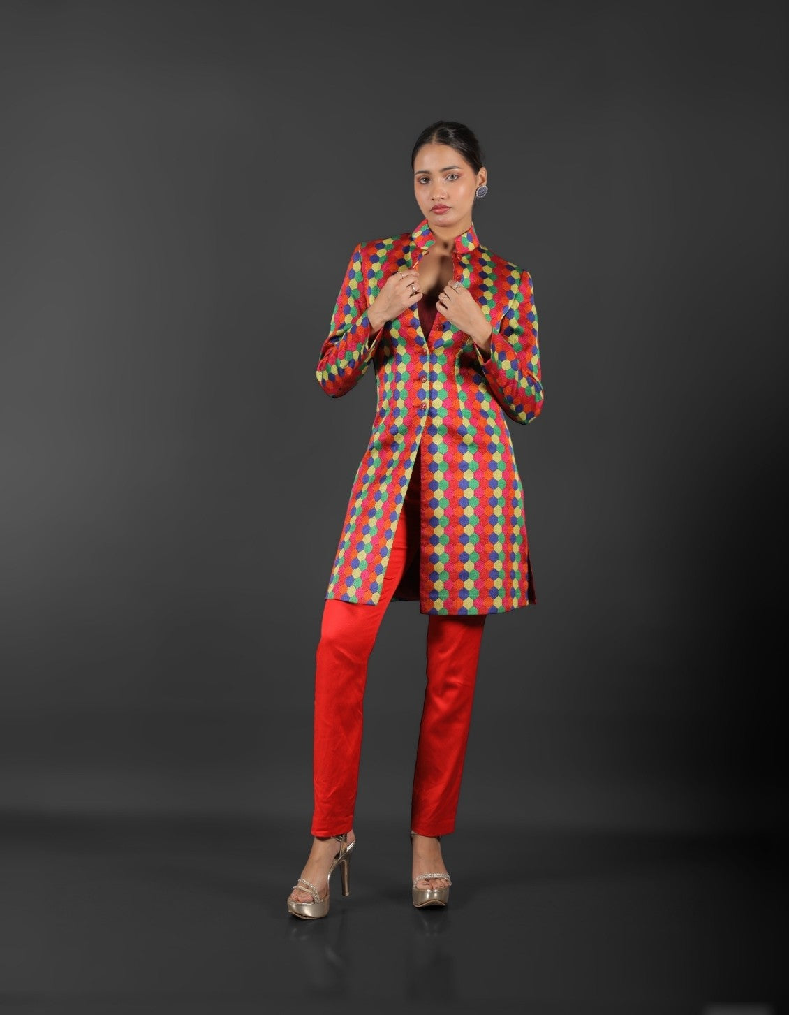 This multicolored Indo-Western ensemble, made from fine brocade fabric with elaborate prints, is sure to turn heads. For a genuinely unique look, the rich texture and vivid detailing combine tradition with modern flair.