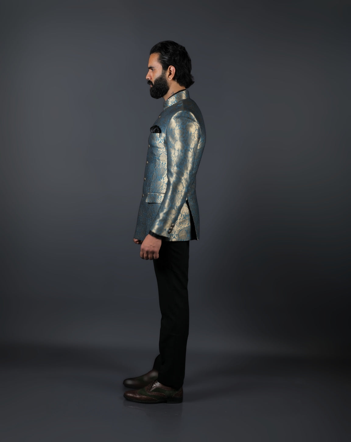 This Bandhgala set, which includes a light blue brocade coat and black teriwool pants, exudes classic elegance. The sleek black pants finish that ensemble with contemporary sophistication, while the rich brocade fabric adds a subtle sheen and royal texture. This ensemble strikes the ideal balance between traditional charm and modern style, making it perfect for weddings, receptions, or festive occasions.