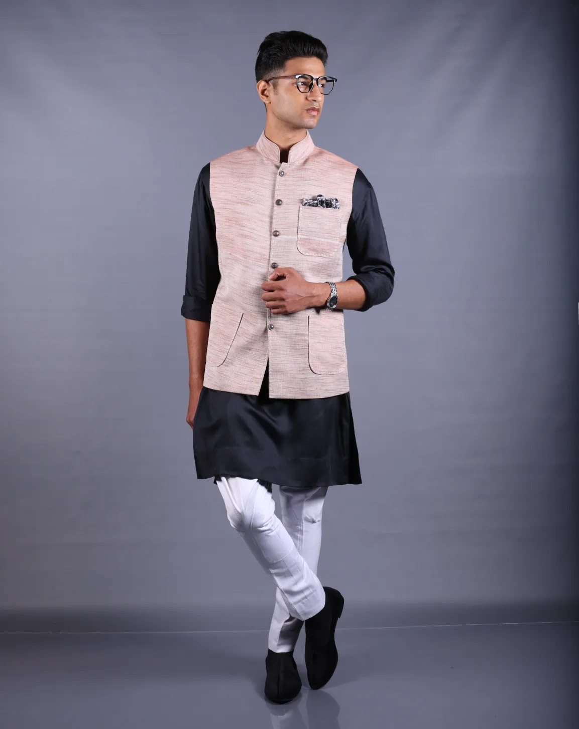 The textured Khadi Nehru jacket features a mandarin collar, button closure, and a pocket square.