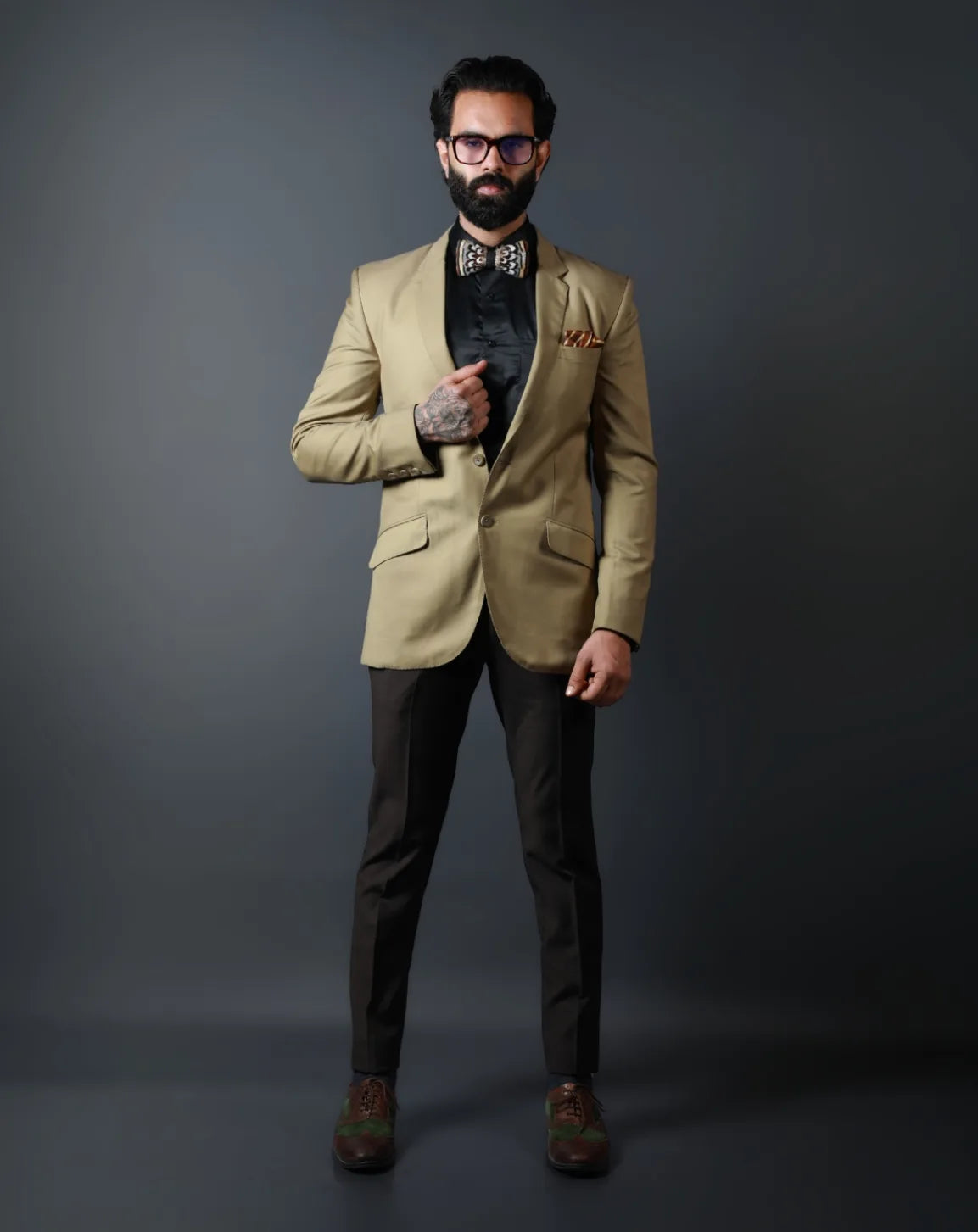 Beige terry wool blazer features a classic notch lapel, two-button closure, and flap pockets.