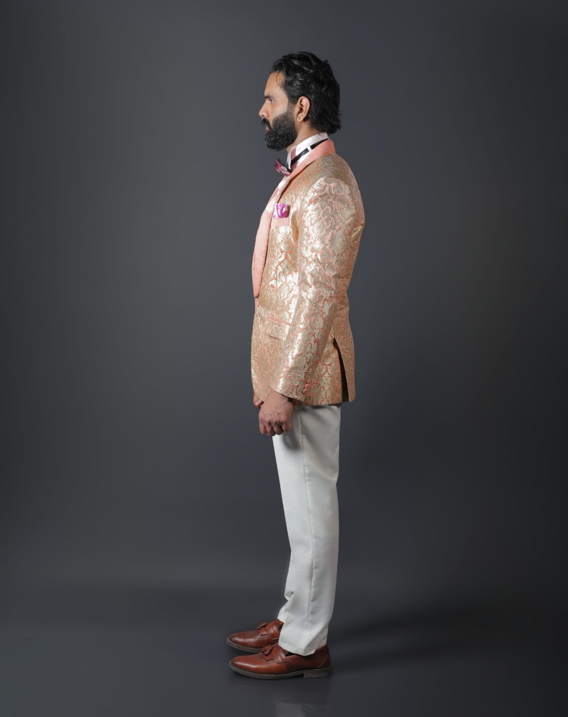 This three-piece tuxedo suit, which includes a white teriwool pantsuit, a printed shirt with a bow tie, and a light pink brocade jacket, exudes modern sophistication. The crisp white pants provide a sophisticated contrast with the brocade fabric's plush sheen and opulent texture. This ensemble combines elegance, charm, and modern style, making it ideal for receptions, cocktail parties, or large celebrations.