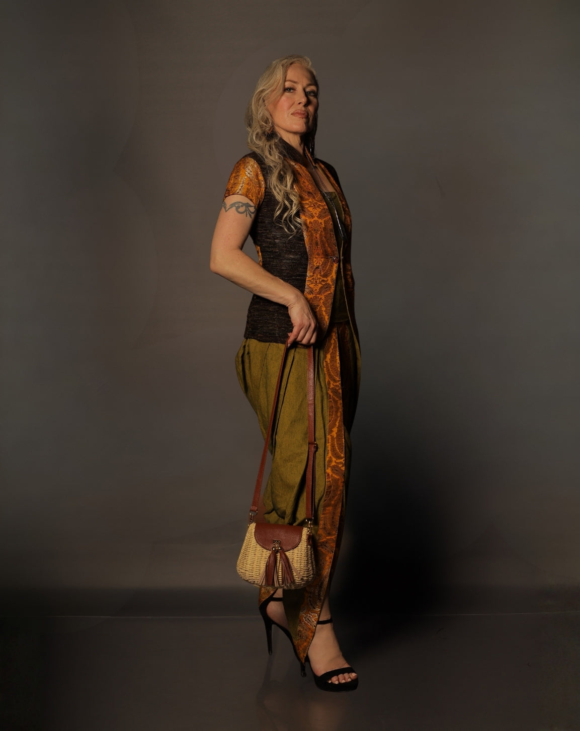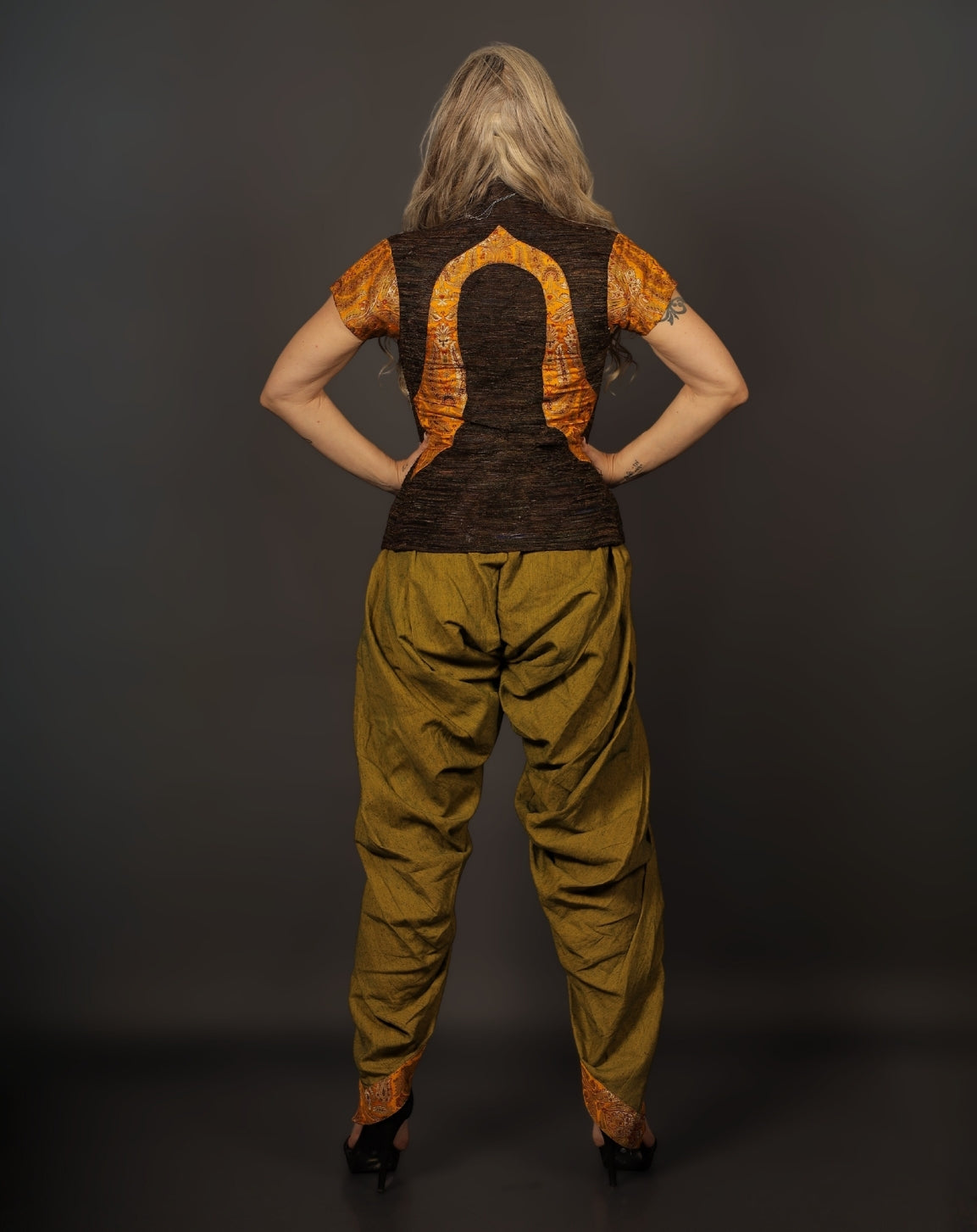 This three-piece Nehru jacket set, which is made of opulent kim khaab fabric with exquisite peacock feather detailing, exudes regal charm. It flawlessly combines traditional elegance with royal sophistication when worn with a dhoti and Nehru jacket.