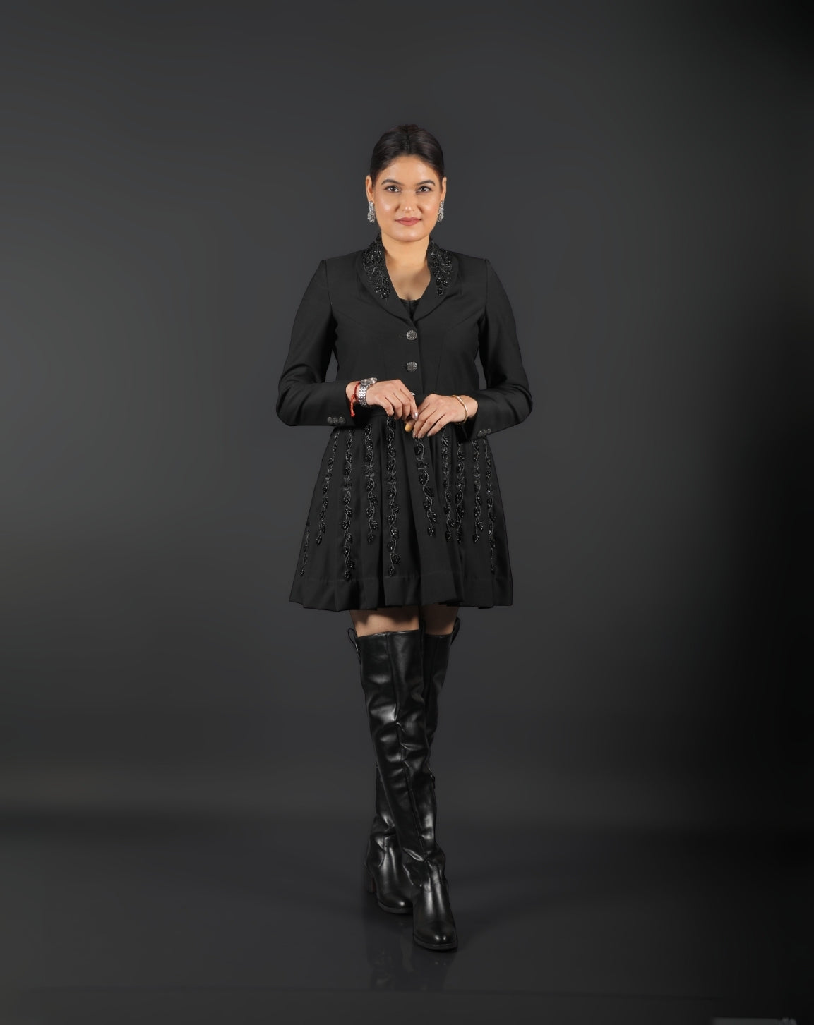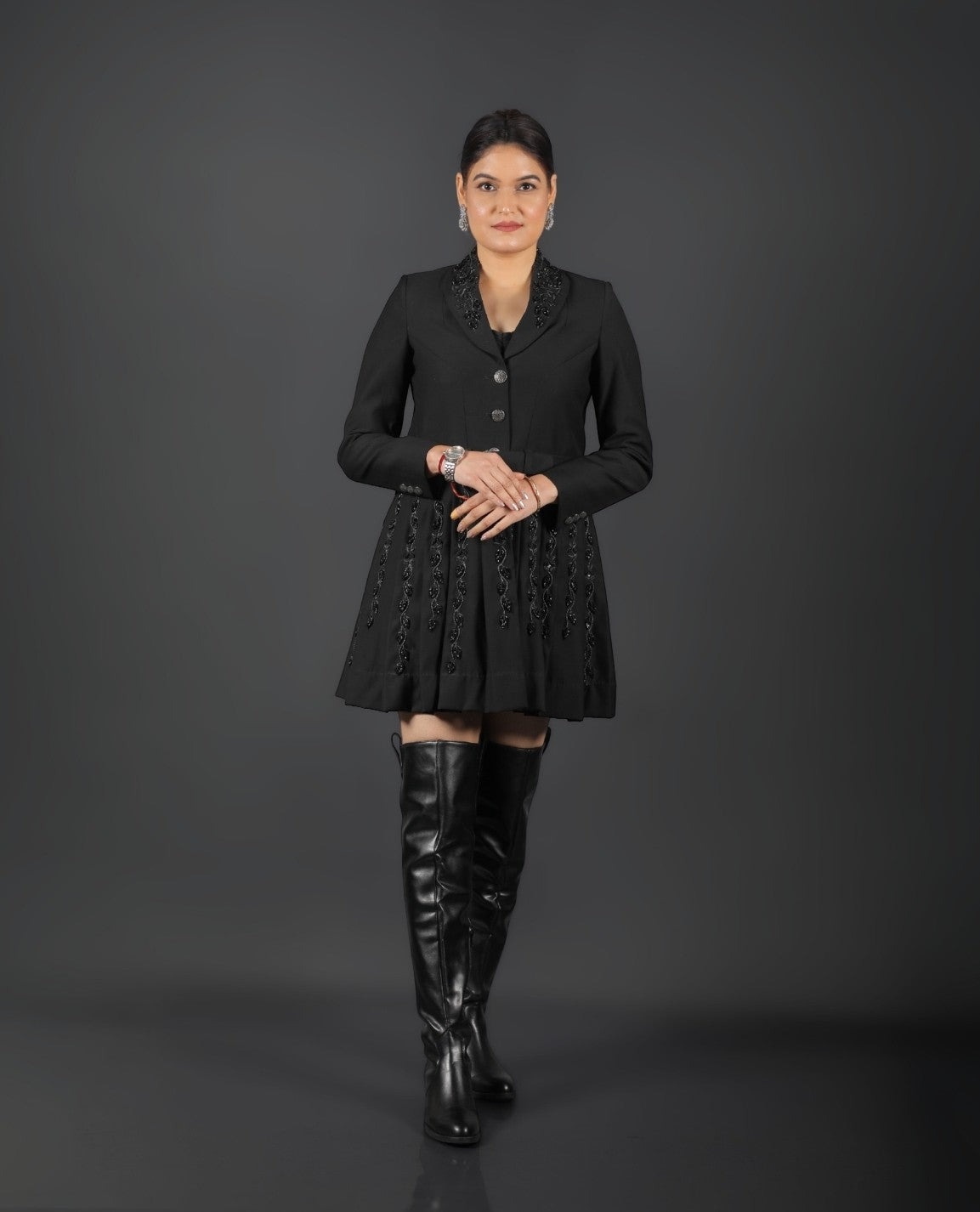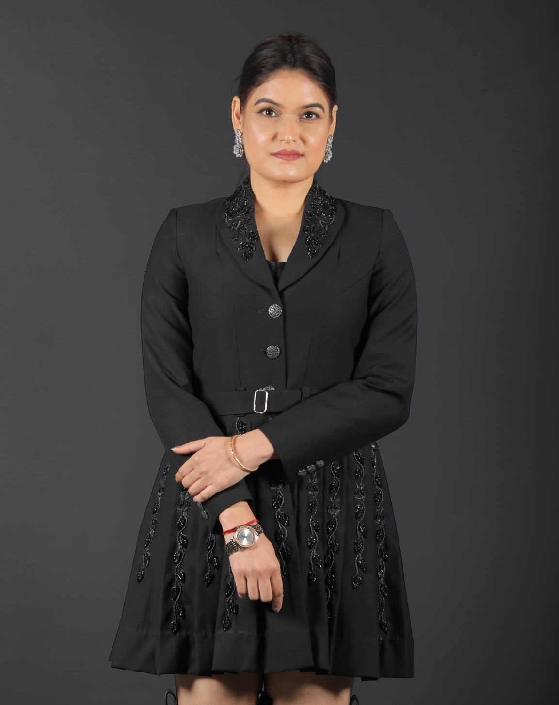 This Turkey Blazer, which is made of high-quality teriwool fabric and embellished with beautiful handwork zardozi, will elevate your look. For events that demand distinction and elegance, the combination of fine texture and elaborate detailing adds a regal charm.