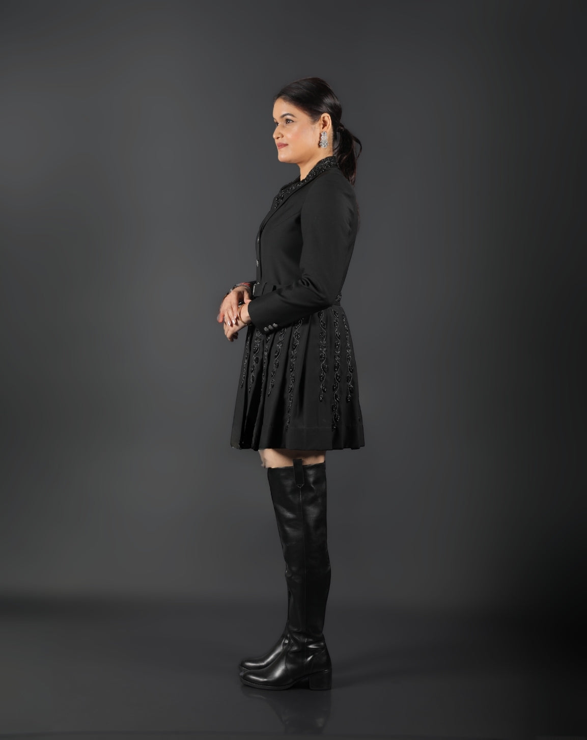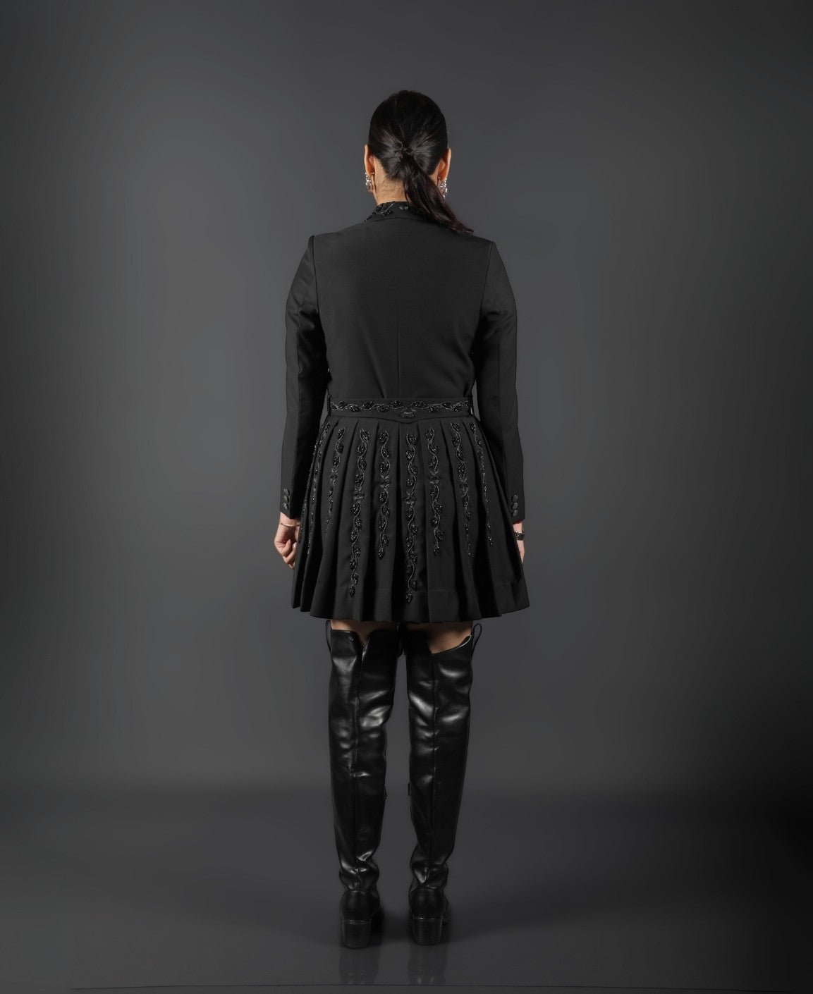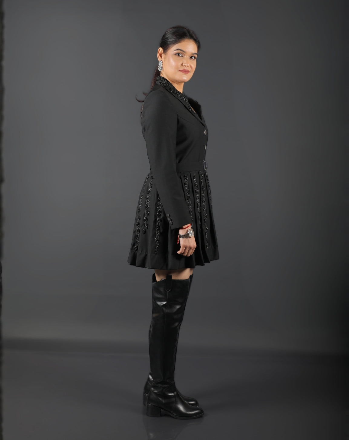 This Turkey Blazer, which is made of high-quality teriwool fabric and embellished with beautiful handwork zardozi, will elevate your look. For events that demand distinction and elegance, the combination of fine texture and elaborate detailing adds a regal charm.